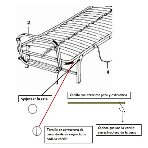 En la figura de la derecha, mostramos el tipo de estructura con la que hay que tener cuidado a la hora de colocarlas, ya que con el uso de éstas camas, el muelle de las patas se afloja y cuando colocas unas patas, al levantar la otra parte o al vestir la cama pueden cerrarse inesperadamente, teniendo un accidente laboral no deseado.Para solucionar el problema, sólo hay que hacer un agujero en una de las patas con un taladro y ponerle una varilla que coja la pata y el soporte de la cama, de tal forma que ya no se cierren las patas.