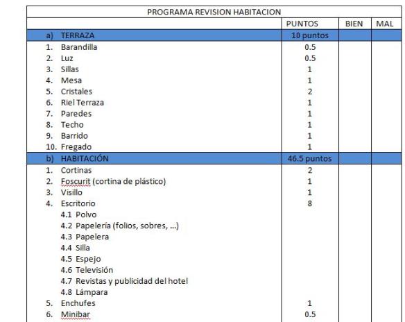 En el checklist habrá que incluir una parte para el nº de habitación, la fecha, el nombre de la persona que supervisa, el nombre de la camarera de piso que ha realizado la habitación y la puntuación máxima de ésa habitación.