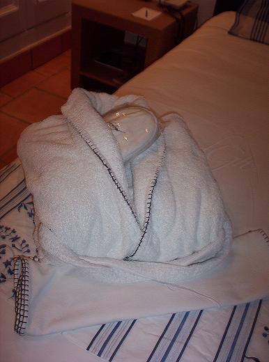 10) Por último pondremos los slippers dentro del cuello del albornoz, también podremos ponerlos encima o al lado, según se prefiera.