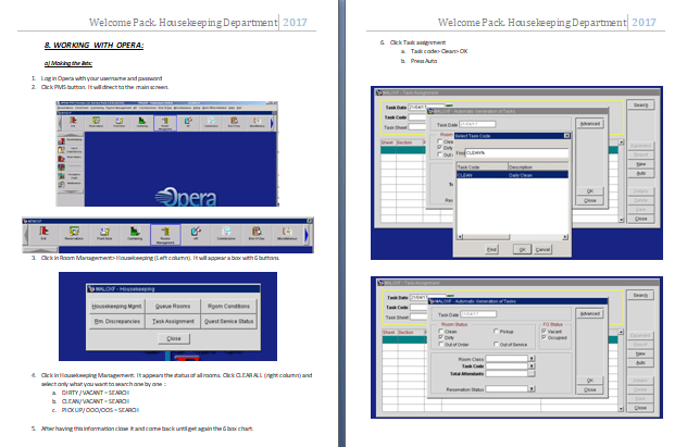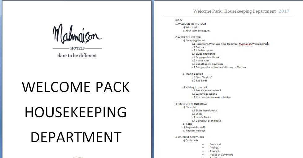 Ese pack de bienvenida tenía lagunas, sobre todo con referencia a los departamentos. Era un pack general que daba igual si trabajabas en Housekeeping, en Cocina, en el restaurante o Recepción. Decidimos mi gobernanta y yo ir un paso más allá y complementarlo con todo lo relativo a nuestro departamento, mostrando, quien era cada uno dentro del organigrama, compañeros de trabajo, zonas del hotel, donde estaban ubicados los almacenes y que se podía encontrar en ellos, horarios de trabajo, vacaciones, como actuar en caso de ponerse enfermo, etc… para al final del dossier tener la parte visual con fotos de los estándares de las habitaciones. Recuerdo haber realizado dos paquetes de bienvenida, uno destinado a camareras de piso/mozos de habitaciones y otro para supervisores, en éste último incluía toda la parte ofimática, programas que se debían utilizar y una explicación paso a paso de cómo se realizaban todas las tareas administrativas.