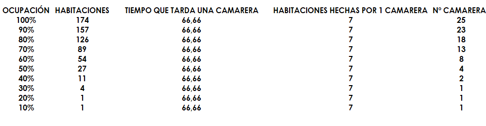 Por lo tanto , se calculan las habitaciones que haría la camarera en una jornada laboral (450 minutos / 66.66 minutos) y nos daría como resultado el número de camareras necesarias según ocupación como se detalla en la siguiente tabla: