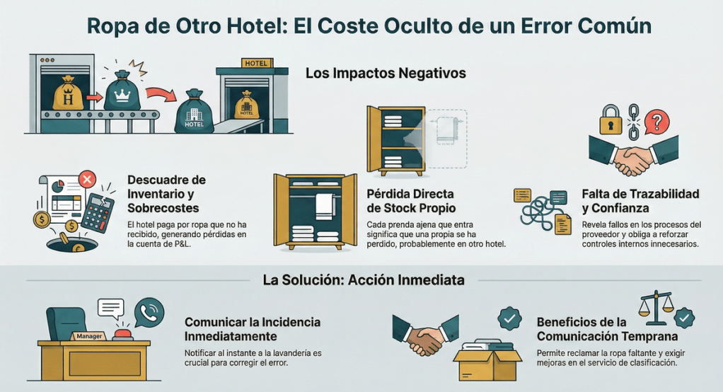 Este tipo de errores no suele detectarse en la lavandería, ya que el proceso de clasificación se realiza de forma industrial y a gran velocidad. La identificación incorrecta entre hoteles que trabajan con la misma empresa, o incluso con cadenas distintas que utilizan textiles similares, provoca que una prenda termine en el establecimiento equivocado. Si no existe un control mínimo en el momento de la recepción, estas prendas pueden incorporarse al circuito interno sin que nadie repare en ello, generando consecuencias que van mucho más allá de una simple confusión puntual.