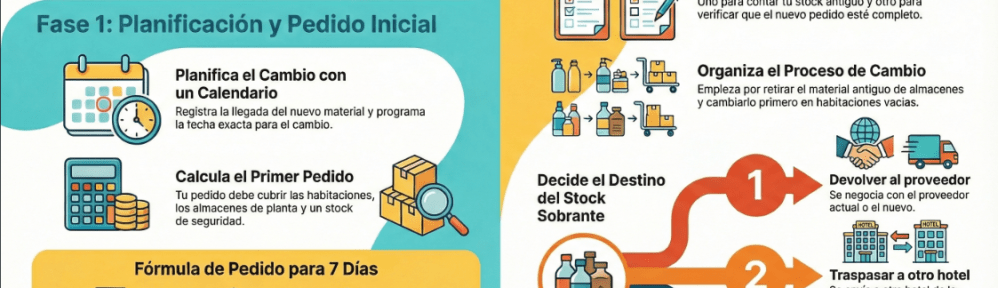 Si el cambio de producto es con el mismo proveedor, normalmente recogen las existencias del producto antiguo y se encargan de mandarlo a otros establecimientos, ajustando nuestra cuenta en futuros pedidos. Si no es el mismo proveedor, habrá que negociarlo, teniendo que estar el material en perfecto estado para su devolución. En caso de que el proveedor no acepte la devolución, se puede intentar traspasar a otro hotel de la cadena que todavía lo esté utilizando y, en último caso y menos deseable, ponerlo a disposición del personal, ya que esto supone una pérdida en el presupuesto y un impacto negativo.