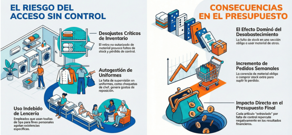 Parece algo a lo que no se le debe dar mucha importancia —“bah, por una toalla”—, pero precisamente esa toalla que se coge sin permiso es la que hace que tengamos desajustes en nuestros inventarios, que desaparezca material o que nos encontremos con faltas de stock por permitir que cualquiera tenga acceso a nuestra lavandería.
