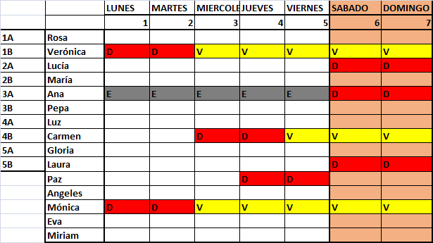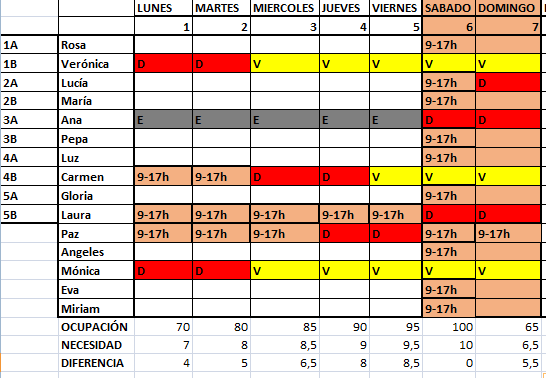 . Medida a tomar: las camareras de piso suben a zonas comunes a adelantar trabajo para así poder contar después con la limpiadora de zonas comunes para echar una mano más tarde como camarera de piso y darle habitaciones. En una hora, de 7:30 a 8:30 se hacen todas las zonas comunes, excepto uno de los bares en donde se queda la limpiadora de zonas comunes, el resto de camareras bajan al despacho para recoger su trabajo y comienza el periplo mañanero.