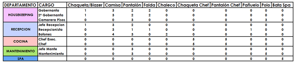 Todo este proceso se refleja en una tabla que agrupa el número total de uniformes por departamento y categoría profesional para realizar un pedido ajustado a las necesidades reales del establecimiento.