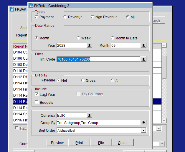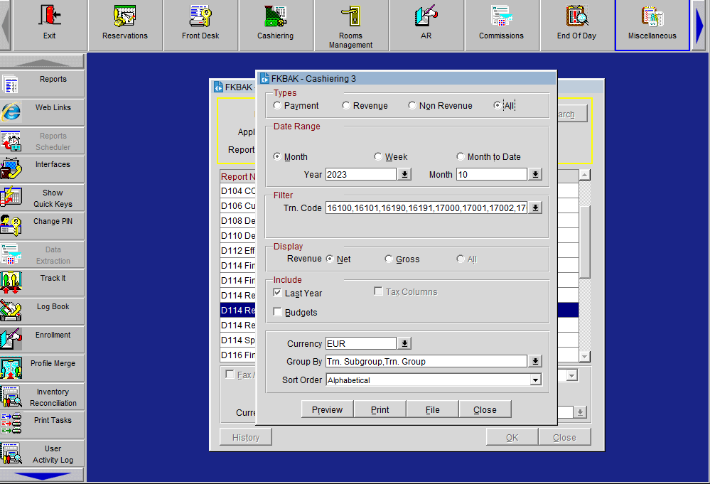 3º. Nos aparecerán todos los reportes de Financial, pero el que nos interesa es el D114 » Revenue by Transaction Code net Rooms»
