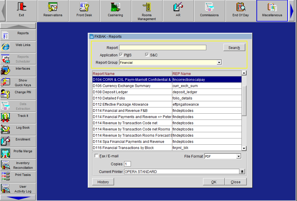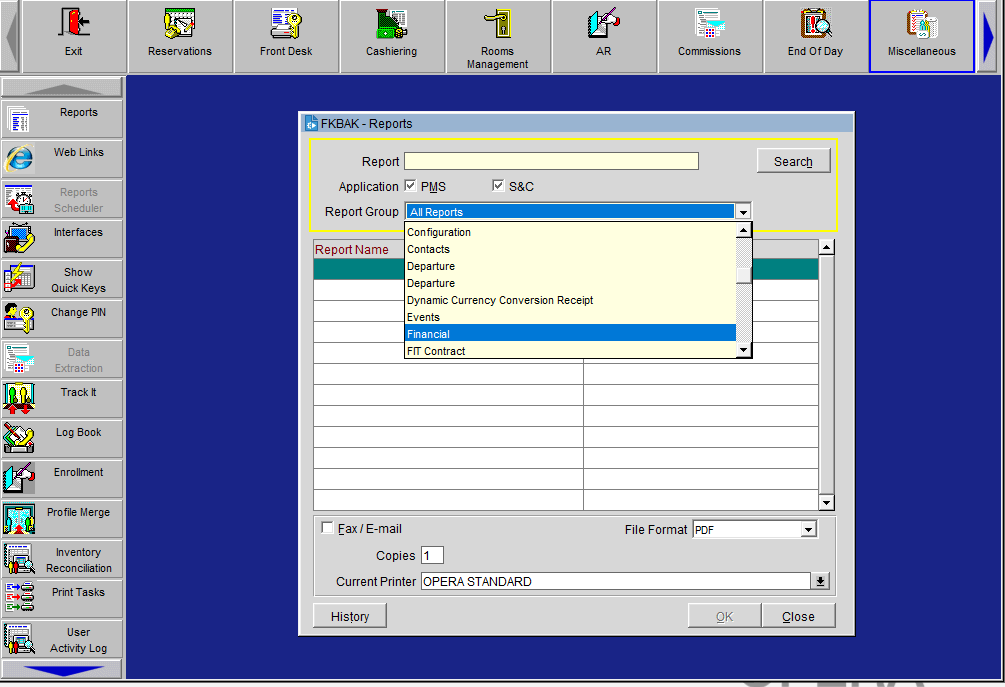 1º. Entramos en Opera Pms y nos encontramos con la pantalla principal, presionamos la pestaña «Miscellaneous» y después «Reports» en la columna de la izquierda.