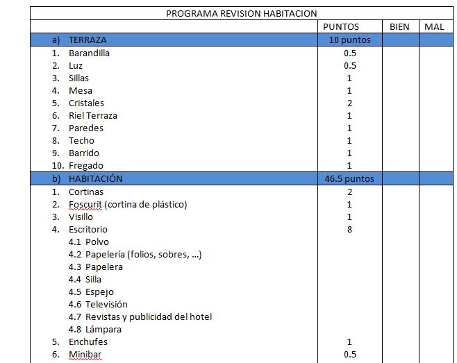 Aparte de ésto cada supervisora debía realizar un control profundo (spot-check) de 2 habitaciónes por camarera de piso que tenía en su zona, uno de habitación de cliente y otro de habitación de salida, y entregar la valoración al final del día a la subgobernanta que lo clasificaba por número de habitación, planta, camarera y supervisora.